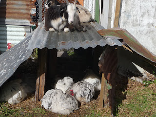 The chicken have a coop built specially for them where they sleep at night, but by day they prefer to hang out with the goats, so I added some leanto's to the goats little hut, so that when it rains, they all have some shelter. However when it's sunny like today, the goats sit on the roof, and the the chickens love to sit in side and dust bath in the sawdust on the floor.